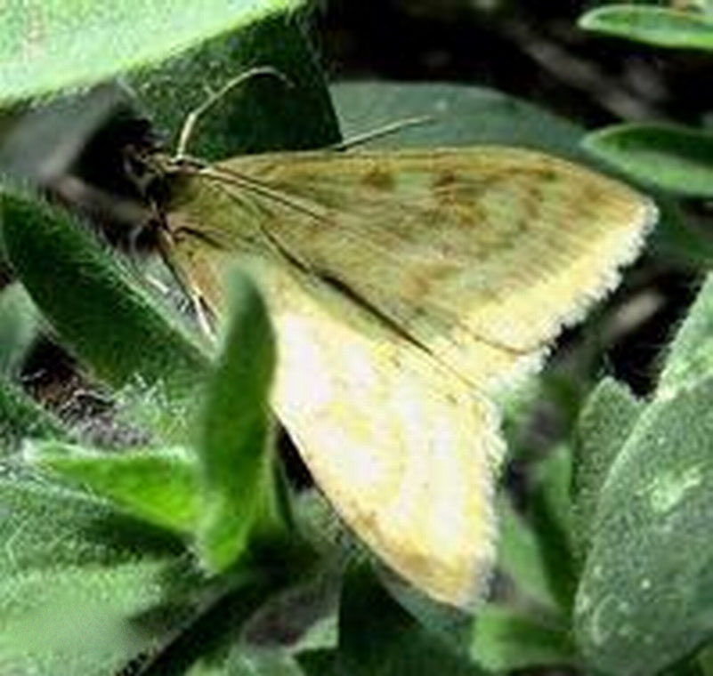 黄褐色,雄蛾体长13-14毫米,翅展22-28毫米,体背黄褐色,前翅内横线为黄褐色波状纹,外横线暗褐色,呈锯齿状纹。雌蛾体长约14-15毫米,翅展28-34毫米,体鲜黄色,各条线纹红褐色。