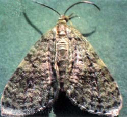 成虫:体长10—15毫米,翅展20—27毫米,全身暗灰褐色,前翅具有紫色光泽,由前缘至后缘有两条灰白色波状条纹,条纹两侧近黑色,条纹中间近灰白色,中室上方有一黑褐色肾状纹,后翘淡灰褐色。