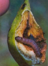 幼虫蛀食梨的果实和花芽,从芽基部蛀人,直达芽心,芽鳞包被不紧,蛀人孔里有黑褐色粉状粪便及丝堵塞;出蛰幼虫蛀食新芽,芽基间堆积有棕黄色末状物,有丝缀连,此芽暂不死,至花序分离期芽鳞片仍不落,开花后花朵全部凋萎。果实被害,受害果孔有虫粪堆积,最后一个被害果,果柄基部有丝与果台相缠,被害果变黑,枯干至冬不落。