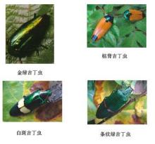 吉丁虫俗称爆皮虫、锈皮虫,属鞘翅目、吉丁科。成虫咬食叶片造成缺刻,幼虫蛀食枝干皮层,被害处有流胶,为害严重时树皮爆裂,故名“爆皮虫”,甚至造成整株枯死。成虫的大小﹑形状因种类而异,小的不足1厘米,大的超过8厘米,头较小,触角和足都很短。幼虫体长而扁,乳白色,大多蛀食树木,也有潜食于树叶中的,严重时能使树皮爆裂,故名“爆皮虫”。吉丁虫是一种极为美丽的甲虫,一般体表具多种色彩的金属光泽,大多色彩绚丽异常,似娇艳迷人的淑女,也被人喻为“彩虹的眼睛”。