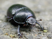 粪金龟Geotrupes sp ,即屎壳郎。广泛分布于各地。体黑色或黑褐色,体表有坚硬的外骨骼,复眼发达,咀嚼式口器,触角鳃叶状,有3对足,足适于开掘,有2对翅,前翅角质化,发育方式为完全变态。蜣螂能利用月光偏振现象进行定位,以帮助取食。有一定的趋光性。目前被评为世界上力气最大的昆虫!