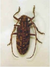 天牛幼虫淡黄或白色,天牛成虫体呈长圆筒形 体前端扩展成圆形,似头状,故俗名圆头钻木虫,上腭强壮,能钻入树内生活两年以上,破坏木材。化蛹前向外钻一孔道,在树内化蛹,新羽化的成虫经此孔道而出。三对足,两对翅。由于这种钻木习性,天牛危害木材和浆材树、景观树、果树以及木本观赏植物甚巨。