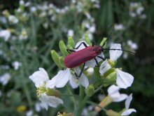 花天牛亚科:(Lepturinae)。包括接骨木天牛(Desmocerus palliatus),肩部似著一黄斗篷,触角多结节,故又称斗篷结节天牛(cloaked knotty-horn beetle)。取食接骨木的花和叶,幼虫钻入茎髓中。