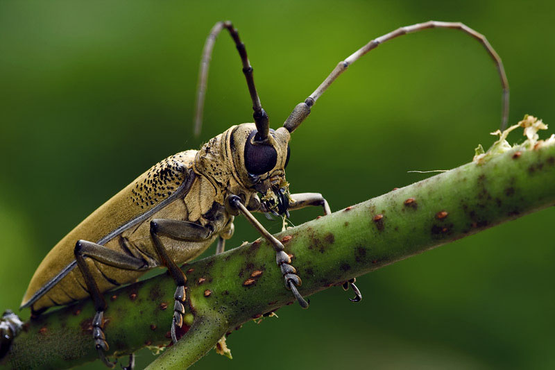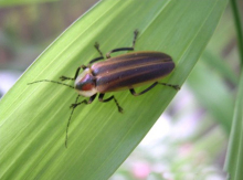 全世界已知1.3万种,仅吉丁甲科Buprestidae1科,分属于12个亚科。我国已知9个亚科,约450余种。体长1.5-60mm;头部较小向下弯折;触角11节,多为短锯齿状;前胸与体后相接紧密,不可活动;前胸腹板发达,端部达及中足基节间;后腹腹板具横缝;鞘翅长,到端部逐渐收狭;足细长;前、中足基节球形,后足基节板状;跗节5-5-5,第4节双叶状;腹部可见5节,第1、第2节一般愈合。幼虫体扁,前胸膨大;头小,无单眼;触角3节;上颚无臼叶,胸足退化。成虫喜阳光,白天活动,在树枝的向阳部分易发现,幼虫在树木中钻孔为害,属钻蛀性害虫。吉丁虫很多种类鞘翅颜色鲜艳,具金属光泽,是最美的昆虫之一。