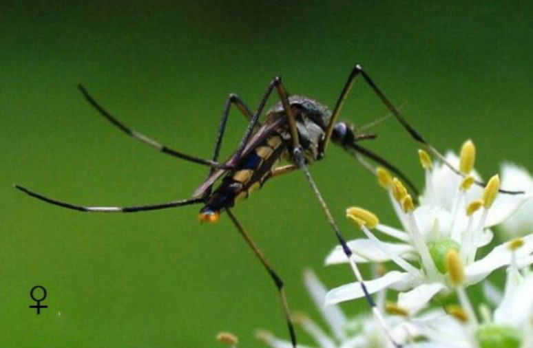 成虫体长约35mm,成蚊腹部有银蓝色和黄色间纹,颜色鲜艳。雄蚊喙部演化成长钩状,羽毛状触角。