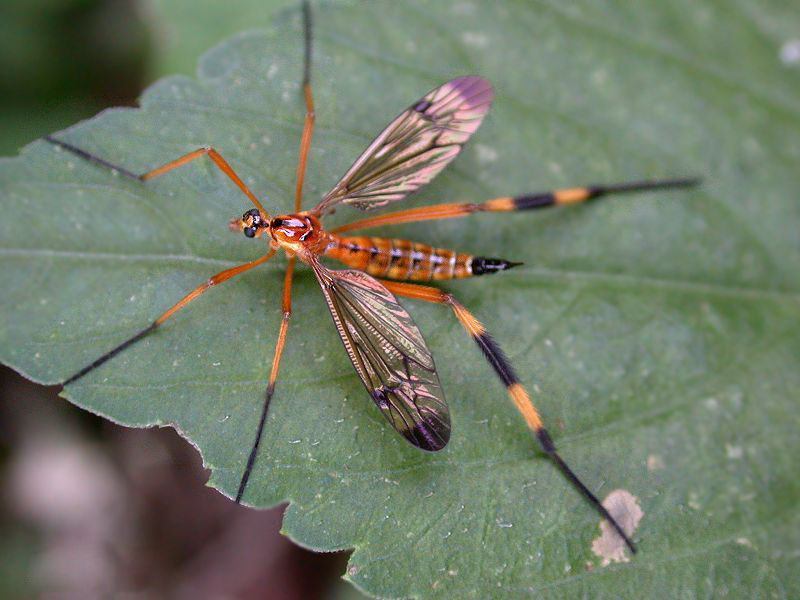 习性:栉大蚊属的大蚊具有鲜明绒黑,橘红,或橘黄体色.此属大蚊多于日间活动,在树林草丛中快速飞行,乍看来犹如蜂类,是很有效的拟态和警戒色.它们的幼虫喜栖身于初期腐朽乔木树干中,雌大蚊常见爬行于树干基部寻觅适宜产卵处所。