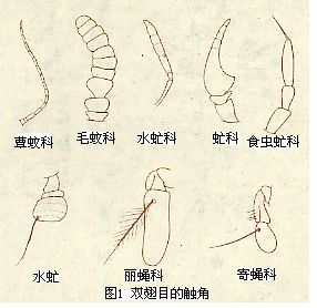 双翅目昆虫的口器为刺吸式口器、舐吸式口器,下唇端部膨大成1对唇瓣,某些种类口器退化。环裂亚目在触角基部上方有一倒“U”字形额囊缝,为成虫羽化初期额囊缩入后存留的痕迹,紧靠额囊缝下方为一月牙形骨片,称新月片,额囊缝与新月片存在与否为环裂亚目分组的重要依据。中胸发达,中胸背板几占背面全部,前、后胸退化,中胸具翅1对,膜质,某些类群具毛(如毛蠓科)或鳞片(如蚊科),后翅退化成平衡棒(很少缺如),极少数种为短翅、无翅或翅退化,翅脉近基本型,常有消失或合并现象。食蚜蝇科r4+5脉与m1+2脉之间有一条贯穿r-m横脉的褶皱状伪脉,为识别该科的主要特征。足短或极长,基节、转节、腿节、胫节上的鬃、毛、栉、齿等装备在有瓣类的分类鉴定上极为重要。跗节5节,爪和爪垫各1对,爪间突通常存在,刚毛状或垫状。腹部分节明显,长角亚目11节,蝇类仅4~5节,末端数节形成尾器、尾叶和外生殖器。雄性尾器常为种类鉴定的重要特征,一般由6~9节特化而成,其构造在各类群中变异很大,使用的术语亦各不同。在长角亚目中,第9或第9、10腹节特化为抱握器;在环裂亚目中,则形成肛尾叶和侧尾叶,合称尾叶,交尾时起抱握作用;雌性尾器主要为产卵器,在蝇类中腹部第6~8节管状,节间膜极发达,形成伸缩自如的产卵器,静止时隐藏腹内不外露。有瓣类头、胸、腹均具一定方式排列的鬃或刚毛,其位置和数目都是分类鉴别的重要特征。