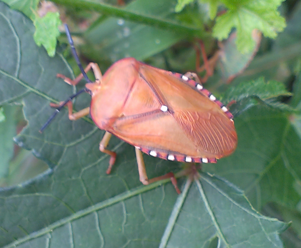 成虫体盾形,黄褐色,腹面有白色蜡粉;触角丝状4节,短粗深褐色;若虫共5龄,初鲜红后变深蓝色。前胸背板两侧鲜红色,后体变橙红色。外缘灰黑色。