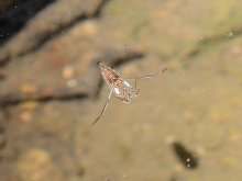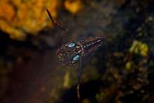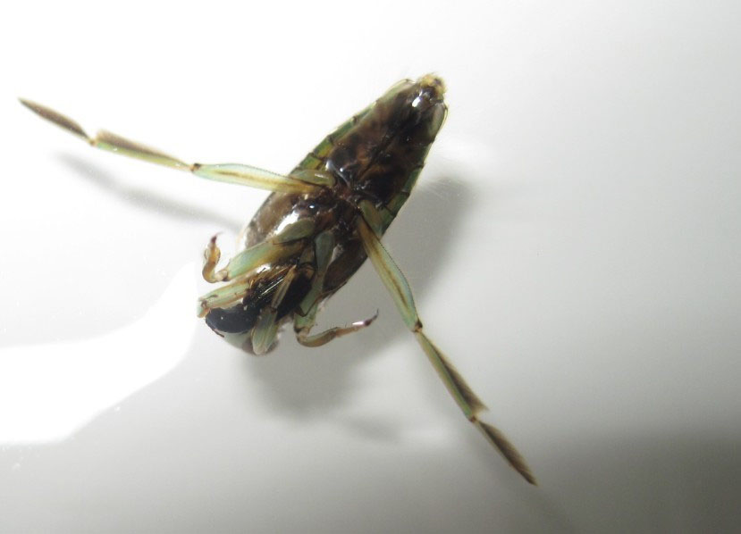 ◆雄虫:体长约10.6 mm,头宽约3.1 mm,体背略黑褐色,腹面土黄色,头部宽略小于前胸背板,复眼发达,红色,略占头部的三分二,触角3节,第2节明显膨大且粗于其余各节,头后缘复眼侧方略凹陷,形成「8」字状的触角窝,于体背方可明显看到触角,这是其它仰泳蝽种类所没有的特征,头盾与复眼宽比例约10比11。前胸背板前半部褐色;翅透明;中、后胸明显向背方隆起,中胸刺突褐色且末端呈分叉状;前、中足特化,演化成适于捕捉与固定的形态,中足的爪其中外侧的1枚粗且弯曲,与若虫爪的形态上有很大得差别;后足演化成适于游泳的足,类似于滑桨般,后足腿节端部有1枚明显的脊起,可以用作区别雌雄的特征,各足跗节2节。腹部背板褐色,腹板上有许多金黄色防水毛对称排列,腹板中央有一列无毛区。