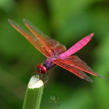 昆虫简介:晓褐蜻常被称作紫红蜻蜓,色彩艳丽,体中小型,腹长25mm。雄性全身及翅脉均为紫红色,额头有蓝黑色金属光泽,胸部具有黑色条状斑纹,翅基部橙红色;雌性体色为橙黄色,胸部及腹部黑色斑纹发达。生活在池塘、小溪等环境周围。