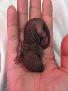 上的胎毛几乎不全,细短能够看得出肚子上血管以及光溜溜皱着的皮肤。