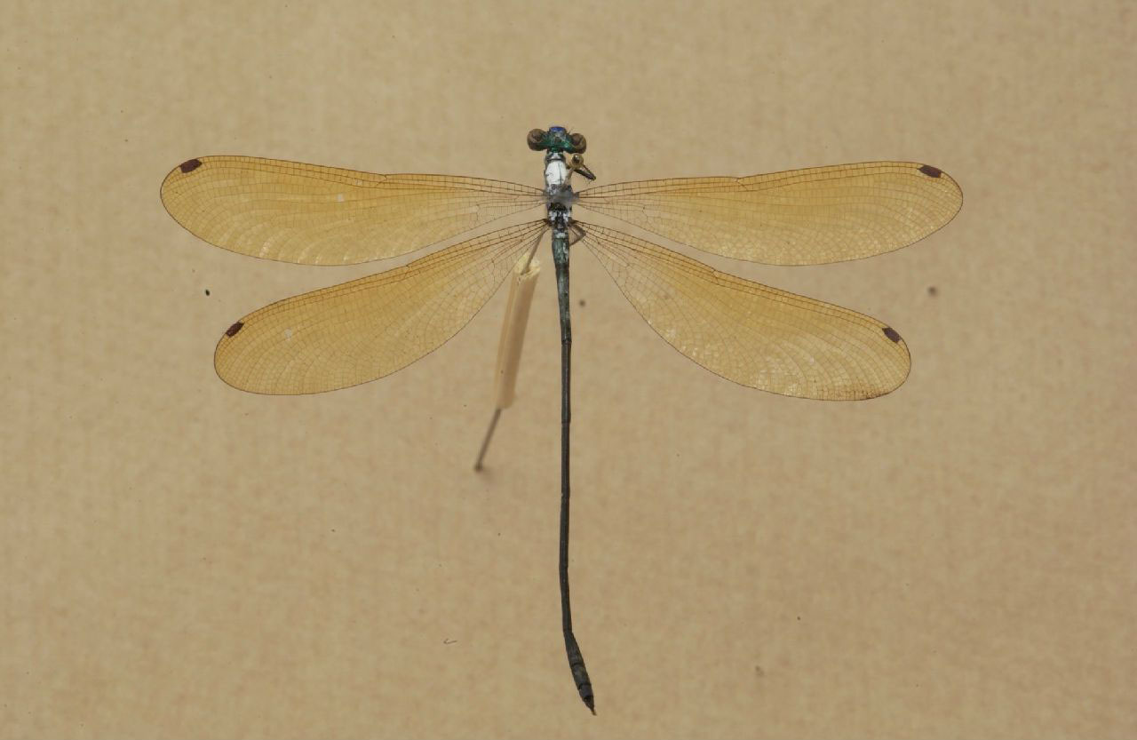雄性:体中型,具绿、褐两色。翅色金黄或黄褐是1个显明的特征。头部 下唇黑褐色。上颚大部分黄色。上唇绿色,有光泽,缘具长毛。后唇基绿色,有光泽。