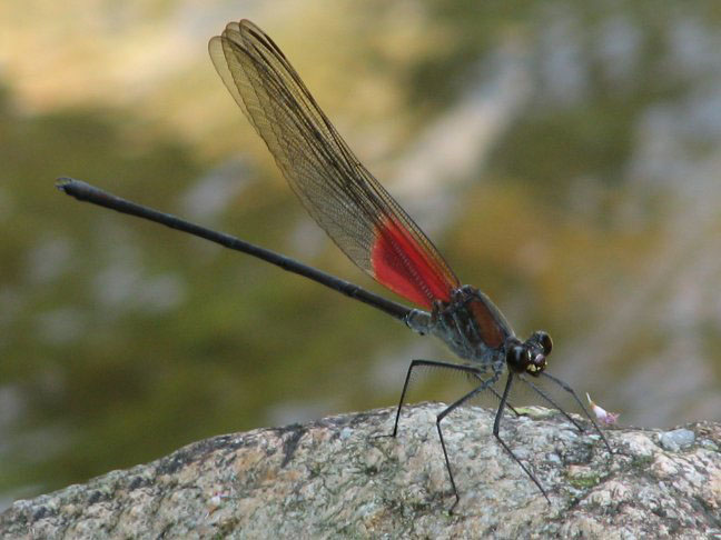 漂亮的中型蜻蜓,体长86mm;雄性上唇黑色,中央具黄色横纹,头其余部分铜绿色;胸部铜绿色,翅基部1/3洋红色,不透明;腹部铜绿色。雌性色彩与雄性近似,但翅为淡褐色,透明。多见于小溪边。