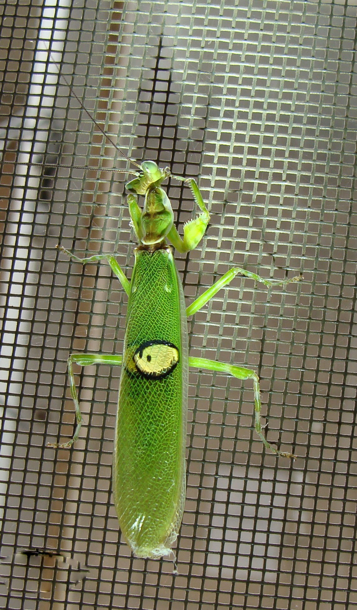 丽眼斑螳,雄性后翅臀域部分缺烟色斑,雌性前翅眼斑两侧的黑带较粗,前翅不超过30mm,国内眼斑螳属最常见的种类。