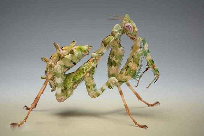 小魔花螳螂分布在分布: 北非、地中海、中东、南亚、加那利群岛( 阿富汗,埃及,阿尔及利亚,埃塞俄比亚,印度,伊朗,以色列,约旦,加那利群岛,利比亚,黎巴嫩,摩洛哥,毛里塔尼亚,尼日尔,阿曼,巴基斯坦,索马里,苏丹,乍得,突尼斯,土耳其,塞浦路斯)体长:60-80mm,有乳白色,米色与浅绿色的条纹,和浅绿色的斑点在成虫的翅膀上。在它们的后面有一个像小尖盾一样的壳用来保护。前腿内侧有橙色和蓝色以及白色斑点。Blepharopsis mendica约6至8厘米, 雄性有更长的翅膀,概括了整个腹部,雌性体积更大与更大的前胸和翅膀,雌性的触须也比雄性的细。小魔花螳螂善于捕捉飞虫小魔花最大的特点就是奇特的体型,较短的前胸和较大的腹部,这些特征使其看上去与一般锥螳大相径庭,强大的消化系统和较大的胆量也使得它成为饲养较简单的螳螂品种。利用其美丽的伪装,耐心地等待,直到猎物来临。当它们张开它们的翅膀,并伸出它的前臂。 在这种姿势,螳螂看起来非常大。 这是为了吓跑掠食者和比本身大的猎物。