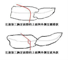 左螯脚略大於右螯脚(与其他品种相比,这品种的左螯其实只大於右螯一些,其他品种两螯相差颇大),密生小颗粒,左螯脚近背侧的内缘有4~7颗齿状的斜向颗粒(白圈处),部分腹侧亦有。左右螫脚内侧皆有刚毛。