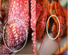 跟据日本千叶县立中央博物馆的朝仓彰研究生与日本琉球大学的仲宗根幸男 教授的论文说,草莓寄居蟹的左边第三胸足前节的上面与外侧呈圆滑状。