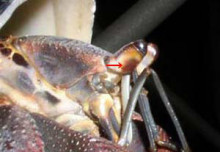 眼晴呈圆型,但与短腕陆寄居蟹稍有不同,其底部较粗,眼睛并不是纯黑色,略带棕红色。眼柄呈白色,底部带有黑褐色斑纹(红色箭头处)。