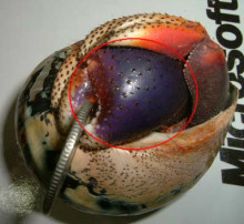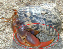 左螯脚大於右螯。左螯脚背部明显呈紫色(红圈处),左螯脚背面没有斜向颗粒,左右螯脚内侧皆有刚毛。但某些深红色的个体(推断应是较年长的成体)左螯脚已看不到明显的紫色。
