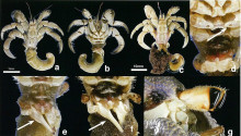 步足关节也呈黄褐色,且具红色血丝状纹,左第三对的前两节与灰白寄居蟹不同,轻微隆起。