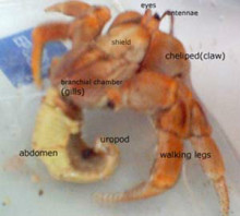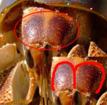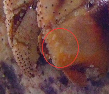 左螯脚大於右螯,左螯脚有不明显的斜向颗粒(红圈处)(资料来自澳洲的Vanessa小姐)。胸足和螯脚著有黑色斑点和深啡色斑纹。