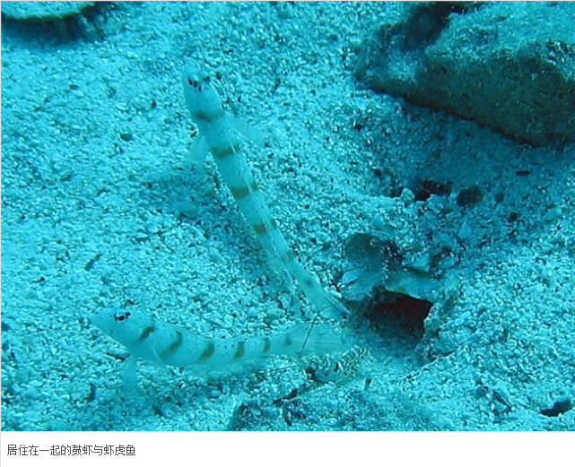 鼓虾及虾虎鱼的共生关系非常有趣,因为鼓虾的视力很差,故它需要有只如看门狗的同伴。虾虎鱼时常在它们居住的洞穴口看守,每当有危险的时候,虾虎鱼便会摆动尾巴来通知同伴。而鼓虾则会不停的挖掘沙泥来保持洞穴畅通,以作为回报。