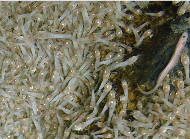 白色盲虾当然是盲的,在黑乎乎的海底深处生活,眼睛已经变得不再重要。但它们的背部会发光,这种发光器可以称为长在背部的“眼睛”,它可以提示盲虾离火山口的距离远近。