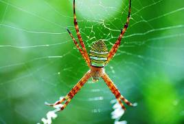 好胜金蛛(Argiope aemula)是园蛛科,金蛛属的一种动物。体长20.00—25.00,为金蛛属中较大的一种。背甲桔黄色,密被白色毛,颈沟和放射沟灰色。胸甲暗褐色,中央黄斑有两对侧支。螯基黄色,外侧有一桔黄细纹,螯爪黑色。前齿堤4齿,后齿堤3齿。触肢黄色上具黑毛。步足淡红褐色,有黑刺,除跗节和后附节外,其余各节腹面有明显的黑色环纹或黑斑。腹部灰黄色,较肥壮,背面有许多黑褐色横带,前半部疏,后半部密并有若干条细纵带,交错成小格斑纹。腹面亚轴部位有一对银色纵斑,纵斑两侧及纺器前方淡灰黑色。外雌器腹面观前隆起呈三角形,框缘宽厚,中隔在基板处向两侧鼓起,中间有一背脊。凹陷侧缘圆而光滑。本种外雌器与链斑金蛛A. catenu—lata相似,但两者腹背斑纹各异,易于辨别。