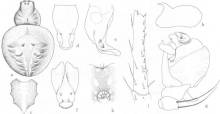 体色和斑纹皆与雌蛛相同。第Ⅱ胫节刺与亚东新园蛛N.yadongensis相似,其区别在中间短刺,本种数目少而且仅一行半。触肢器顶突扁,较亚东新园蛛引导器基部较窄,远端侧面观不呈鸟首状,中突也不相同。