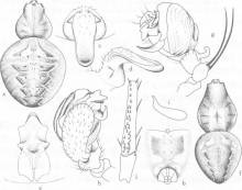 腹面正中灰褐色,白垩斑四块,两侧呈条状,后方纺器前白斑近圆形,纺器赤褐色,周围有白斑。外雌器的垂体呈长三角形,最宽处位于前缘稍后。基部短圆柱形,与垂体的交角稍大于90°。侧叶一对,远端呈锥状,位于垂体弯折处偏背侧。交媾孔开口于侧叶之后缘。