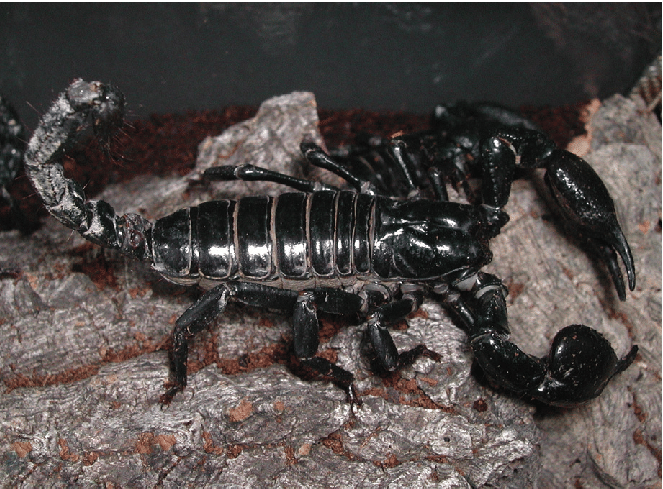 一种分布在东南亚地区,通体呈黑色的大型森林蝎,体态与亚洲雨林蝎十分相似,不同处是钳子上很明显的凹槽和四条横纹。毒性微弱,一般不会对人体造成伤害,但其钳子具有很大的力量。