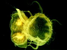 受精卵发育成带纤毛的浮浪幼虫,浮浪幼虫在定置前形成一种凸面的圆形浮浪幼体囊,经脱囊狭窄柄部拉长进而变成一个细长颈瓶形状,萌发出4个触手成为早期螅状体;