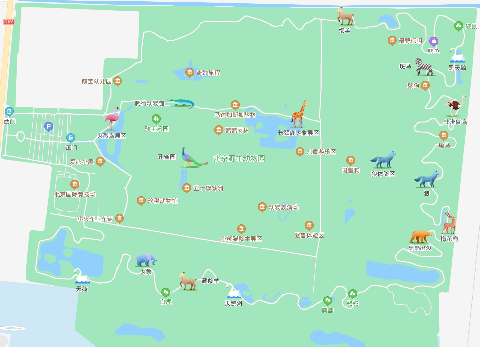 动物园整体分为三个区域,分别为步行游览区、自驾游览区、猛兽体验区。