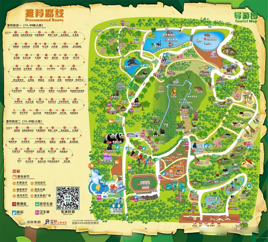 湿地园 →马达加斯加狐猴园 →长臂猿群岛 →雉鸡鸟类一条街→孔雀园 →袋鼠园 →猕猴戏月 →桃花园 →牦牛园 →羊驼园 →鸵鸟园 →非洲之角 →欧洲盘羊岭 →野象谷 → 爱情湖 → 企鹅岛 →鳄鱼湾 → 鸟类表演馆 →两栖爬行动物馆 → 猿猴村 →群狮群虎表演馆 →熊猫庄园 → 杂食馆/熊猫馆 → 海洋天地 → 珍稀鸟街 → 百兽盛会 → 中型猛兽馆 →猛兽谷 →虎跳峡 →游乐天地 →亲水乐园 → 动物学科普馆 → 宝宝乐园 →湿地园 → 出口