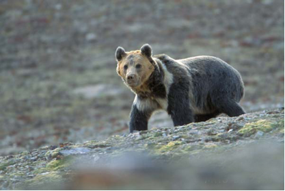 形态特征:西藏棕熊是世界上最稀少的棕熊之一。躯体粗壮强健,性凶猛而力大,体长约1.8-2.1米,肩宽约1米,体重最大者接近400千克。头宽而吻尖长,耳壳圆形,肩高超过臀高,站立时肩部隆起,尾特短,四肢特粗壮,前足腕垫不与掌垫相连,毛被丰厚,背部毛长130-150毫米,体侧毛长200毫米左右,毛色以棕褐色为主,变异较大,有棕褐色、褐黑色、污白色,褐黄色等,老年熊呈银灰色;幼年为棕黑色,颈部有一白色领环;胸毛长达10厘米。脚掌裸露,具厚实的足垫,但前足腕垫不如黑熊的宽大,与掌垫分开。胸前有一个比黑熊更大的白色月牙形斑,一直向背延伸到肩部。四肢通常是黑色,也有淡色的。爪的颜色随四肢色而变化,但多为淡色。它的两耳和四肢一般呈黑褐色。