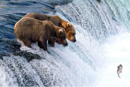 生活习性:阿拉斯加棕熊会游泳,非常善于捕鱼。每年夏秋季,生活在海洋里的鲑鱼要游回河里产卵,这时棕熊聚在一起捕鱼,阿拉斯加棕熊会事先站在河道的关键位置上,用肥大的熊掌或者长满锋利牙齿的大嘴捕捉逆流而上的鲑鱼。该亚种不是纯食肉动物,除了吃鱼、牲畜、啮齿动物和小鸟,也吃浆果、果实、菜草和昆虫,在饥饿时,也会袭击山羊、鹿、麋等体型较大的动物。