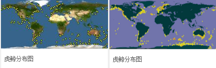 尽管虎鲸在世界范围内都有发现,但据报道,热带地区的密度比北极和南极的最高纬度低了1-2个数量级。在大陆边缘,虎鲸更为普遍。但是,这种一般模式存在一些差异,似乎与海洋生产力有关。在温暖的西部边界洋流(如墨西哥湾流或黑潮洋流)中,虎鲸似乎不如在生产力更高的东部边界洋流(如加州洋流)中普遍。但是,它们在千岛寒流和福克兰洋流等冷水西部边界洋流中也很常见。