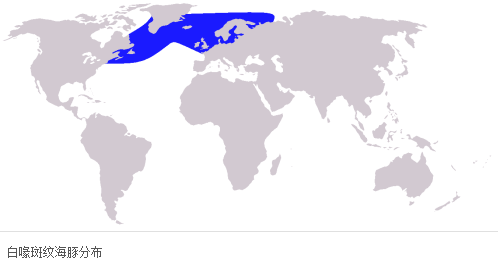 分布于北大西洋及临近的巴伦支海、波罗的海、戴维斯海峡和科德角海域。白喙斑纹海豚游泳快捷,有力。常于船只前后乘波逐浪,表演一系列水面杂技。以群游性鱼类、甲壳类、头足类动物为食。
