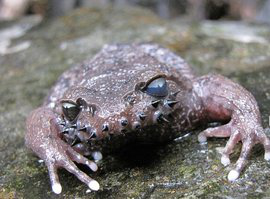 第二性征:雄蟾上唇缘每侧有排列不规则的黑色角质刺10-24枚。雄蟾无声囊。
