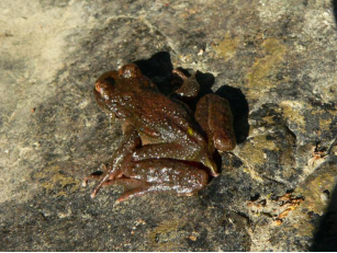 形态特征:尾蟾全长3.7-5.0厘米,寿命15-20年。有软骨支撑的尾状构造,故名为尾蟾。背部皮肤相当粗糙,拟态周围居住岩石的颜色,通常是橄榄灰色、棕色、红色或黑色,上有三角形黄色和灰色,浅黄色或绿色的斑纹,身体及四肢纤细,头平扁,吻尖,瞳孔垂直,没有鼓膜,鼻子上的黑眼纹一直延伸至眼睛后。有硬化的指尖般爪子,以帮助在水流底部的岩石之间爬行。主要用肺呼吸。由于肺的结构比较简单,皮肤起着重要的辅助呼吸作用,皮肤呼吸主要排出二氧化碳。
